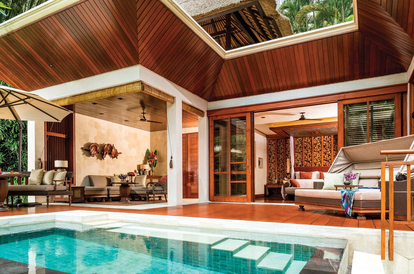 全60室の客室は、ロビーやメインレストランからも近く、広々とした空間でゆったりとくつろげる18室のスイートと、プライベートプールとゆったりしたバルコニーやテラスを備えた42棟のヴィラによって形成されています。