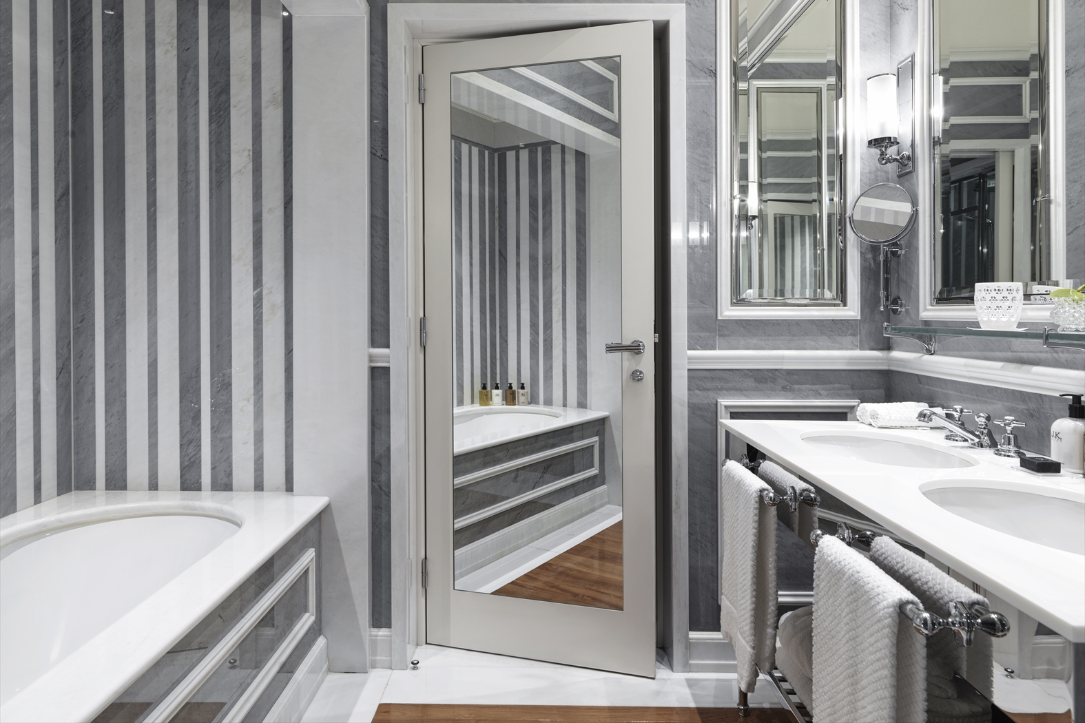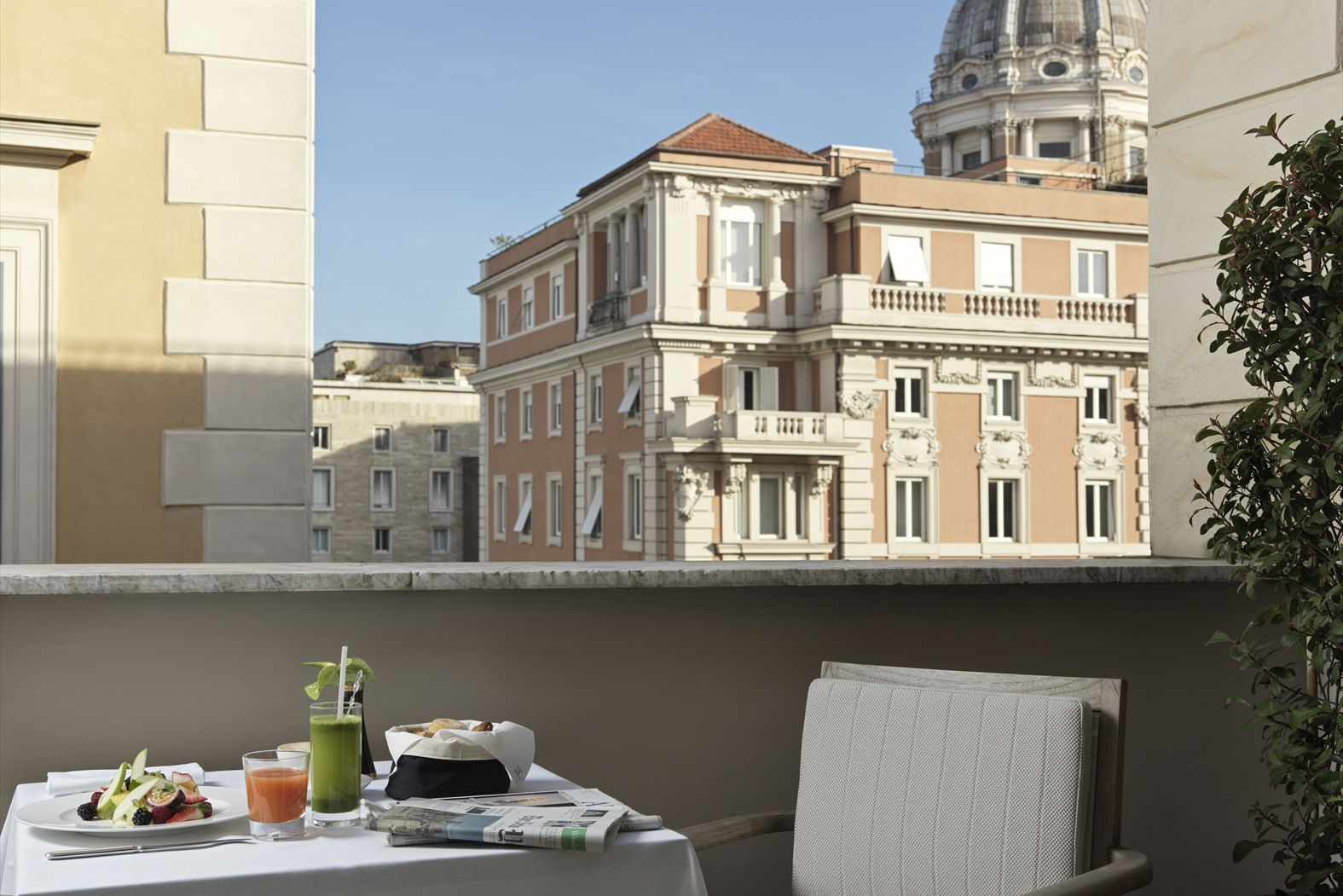 全27室の客室は、一つとして同じデザインがありません。センスの良い色使いの上質なファブリックと柔らかな照明が、邸宅に招かれたような居心地を演出します。バスルームには白とグレーのカッラーラ大理石が惜しげもなく使われ、プライベートのバルコニーが付いた部屋からはボルゲーゼ地区の街並みが見渡せます。