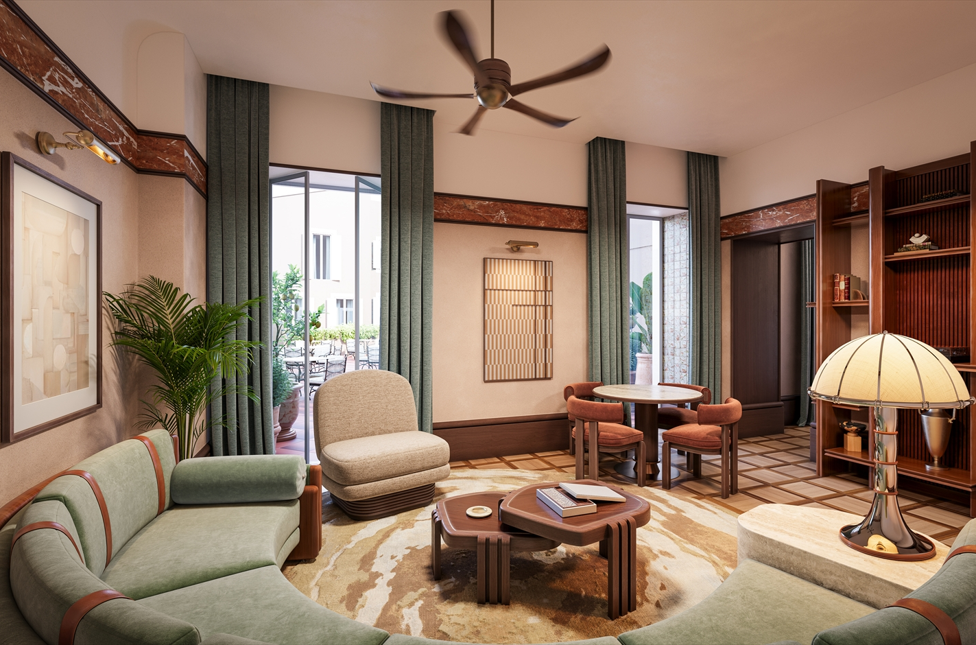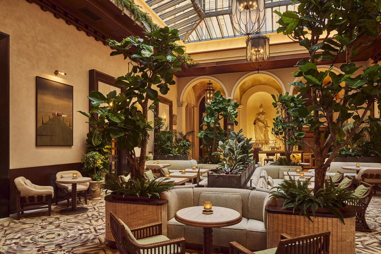 館内は、17世紀の大理石像やムラノガラスのシャンデリアなどオリジナルの意匠を残しつつ、アールデコのエレガンスを融合。ロビーにはローマの空を模した天井画、客室にはオリエント急行の客車を思わせる木製ディテールや専用トランクのナイトテーブルなど、“旅のロマン”が息づいています。全93室・36スイートはすべて異なるデザインで、手描きの天井画やムラノランプ、ヴィンテージのレコードプレーヤーなど、細部に至るまでこだわり抜いた空間です。