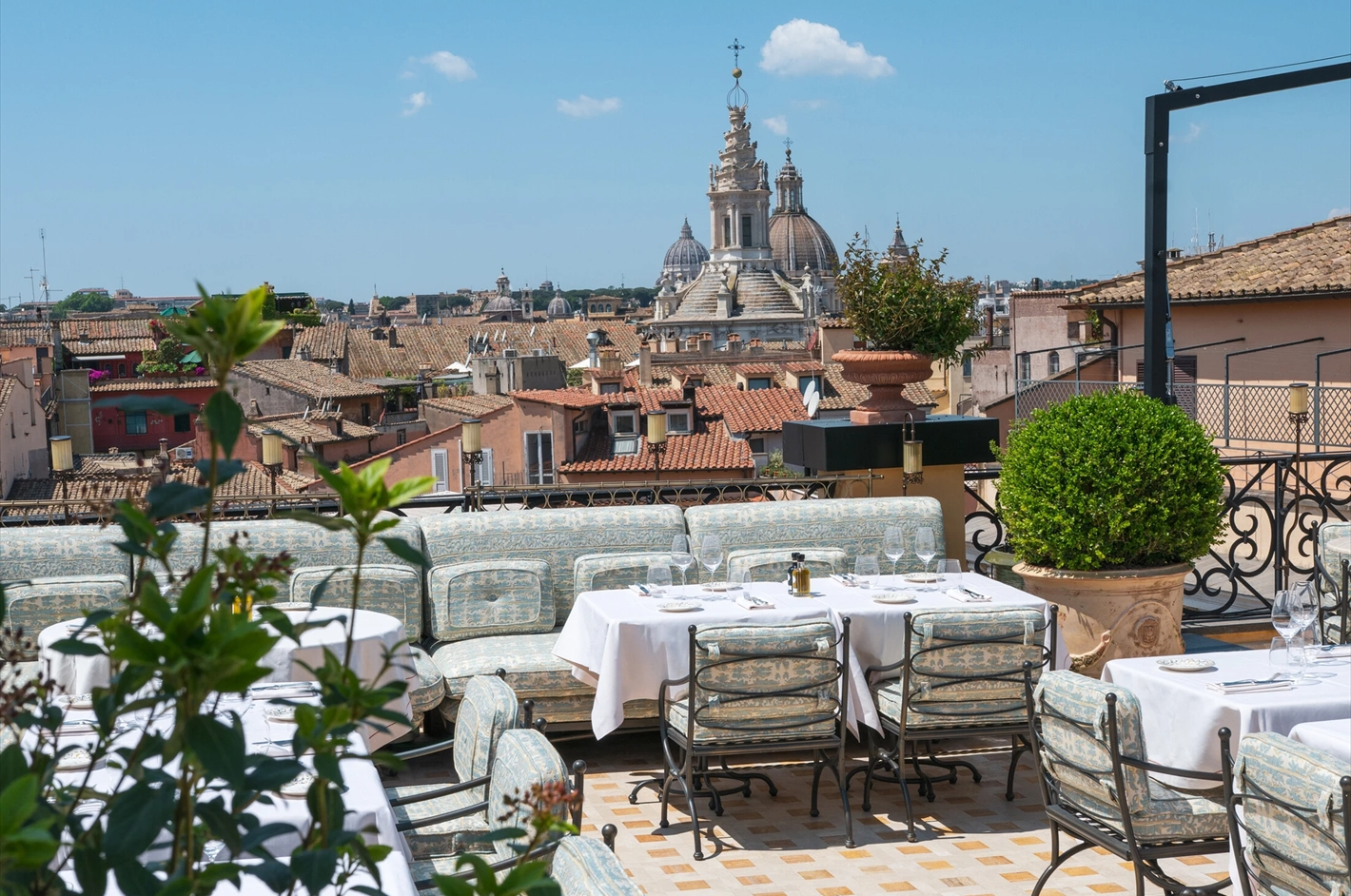 ローマの街並みを360度見渡す絶景のルーフトップレストラン「Voliera」。パンテオンの丸天井を“ほぼ同じ目線で眺めながら” 食事ができる場所は、ローマでもほんのわずかでしょう。夜、ライトアップされたパンテオンが幻想的に浮かび上がる光景を眺めつつ、ローマらしい一皿やカクテルをゆっくり楽しむ時間は、ローマの中心に招かれたような体験です。
