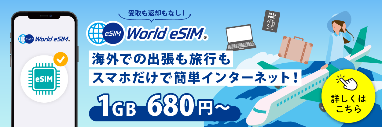 World eSIM スマートフォンに差し替え不要の内蔵型SIM(eSIM)で、海外200以上の国・地域でデータ通信が利用できるサービス ご希望の方は、下記リンク先(外部サイト)からお申し込みください。