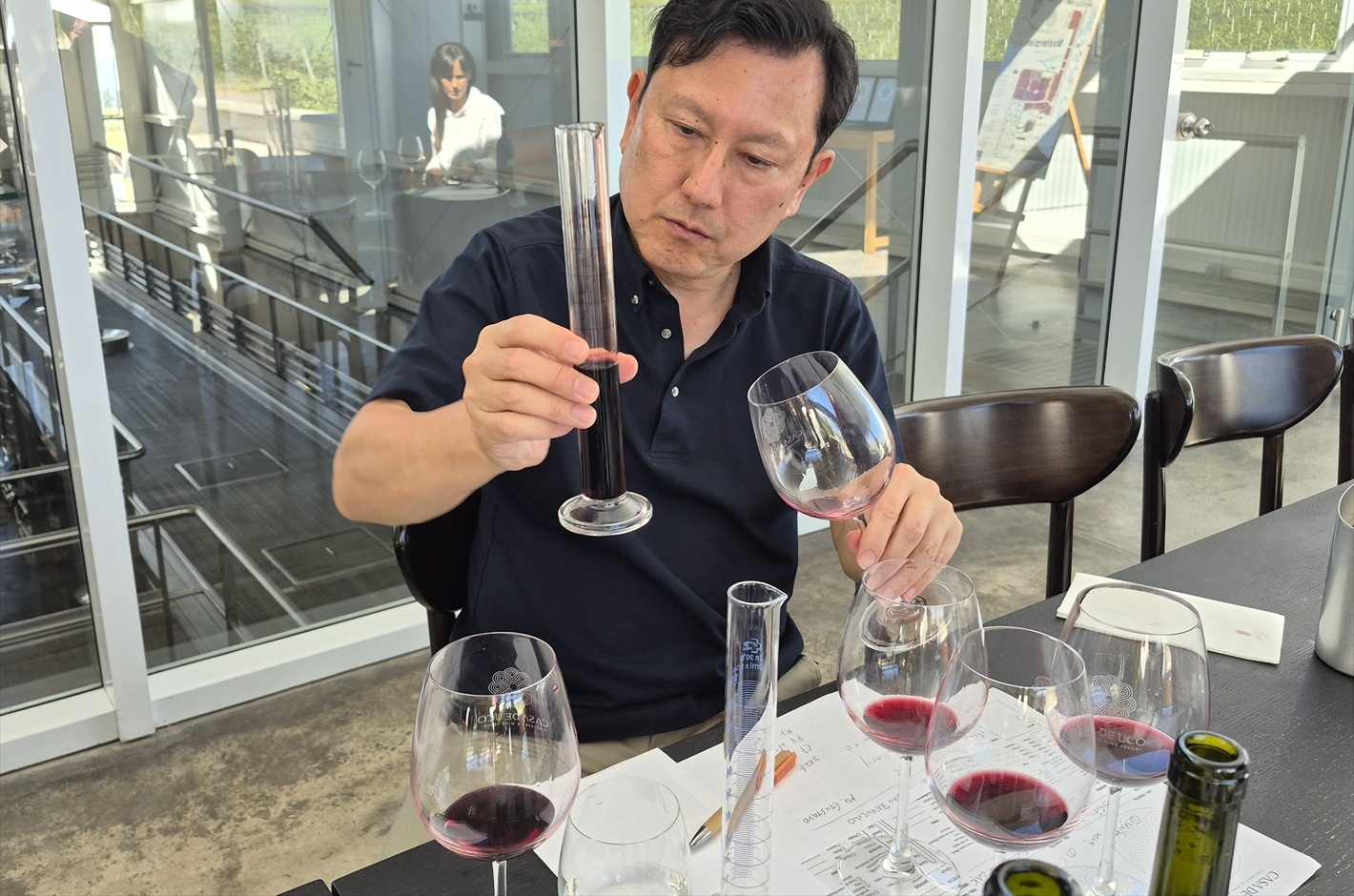 ワイナリー2階のラボにて、ワインメーカーGustavo氏のレクチャーと手ほどきによるセッションを実施。シリンダーとペンを交互に持ち替え、感覚を研ぎ澄ませつつ何度も試し、徐々に好みの方向性を絞っていく。「樽熟成を経た時の状態をイメージするように」とのアドバイスだったが、到底その領域に達しているはずもなく。とは言え、この工程に関われることこそが、ワイン造りの造醍醐味でもある。さて、樽熟成を経た2025年ヴィンテージの出来栄えは如何に…。