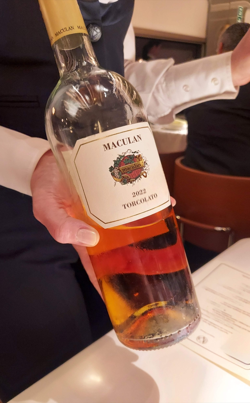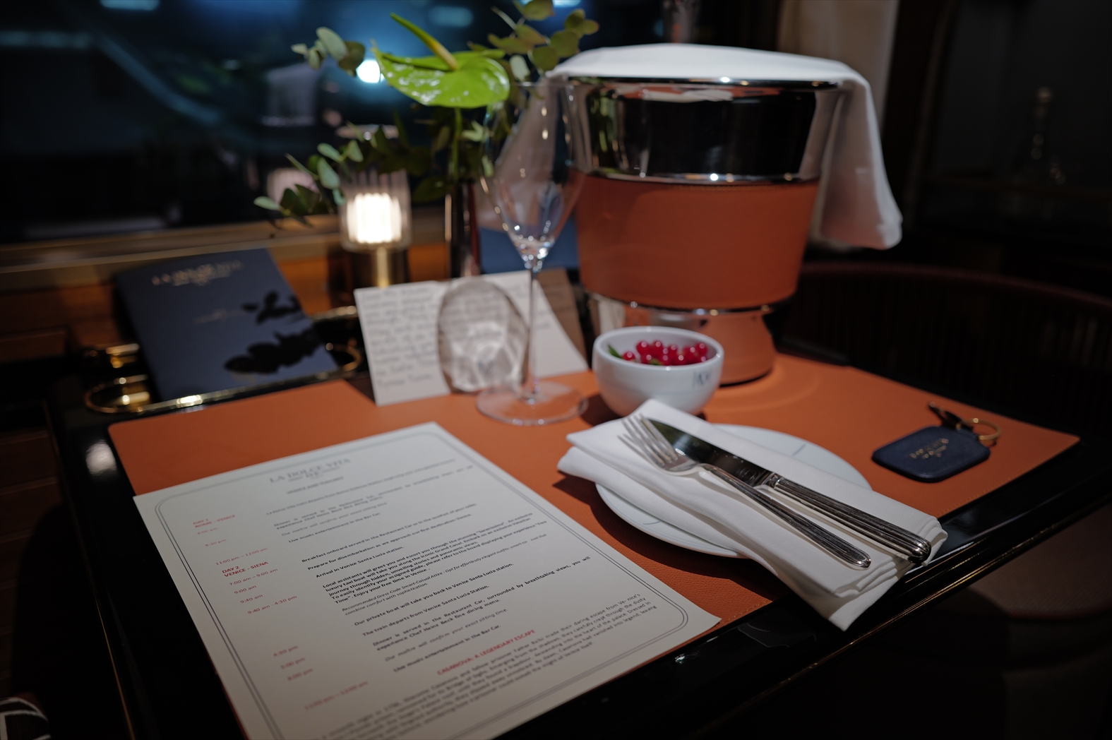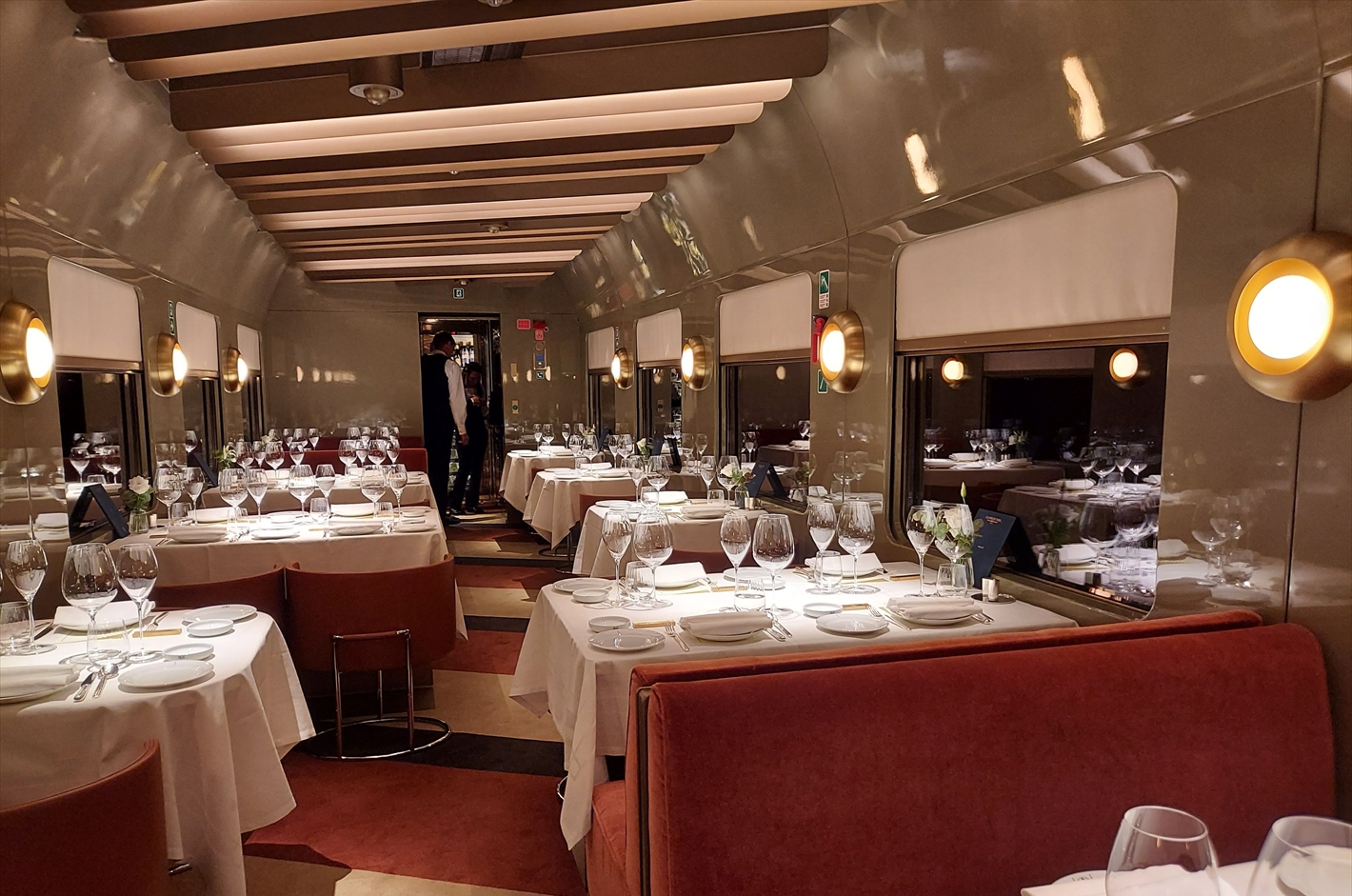 無事にローマを出発して間もなく、ディナーの時間。ディナーのドレスコードはLa Dolce Vita Elegance-1960年代のイタリア映画を彷彿とさせるシルクのカクテルドレス♪ ということで、華やかに着飾った乗客の方々が集まったダイニングカーはイタリアの社交場さながらの輝きを放っていた。
