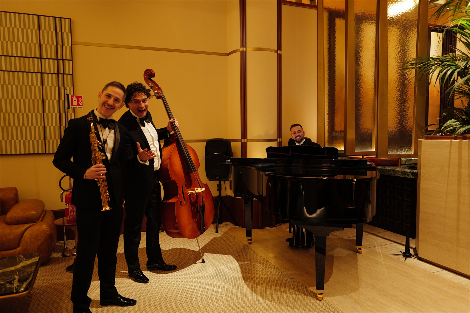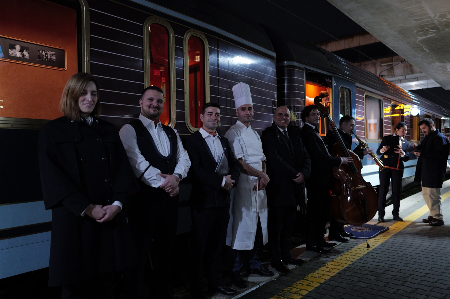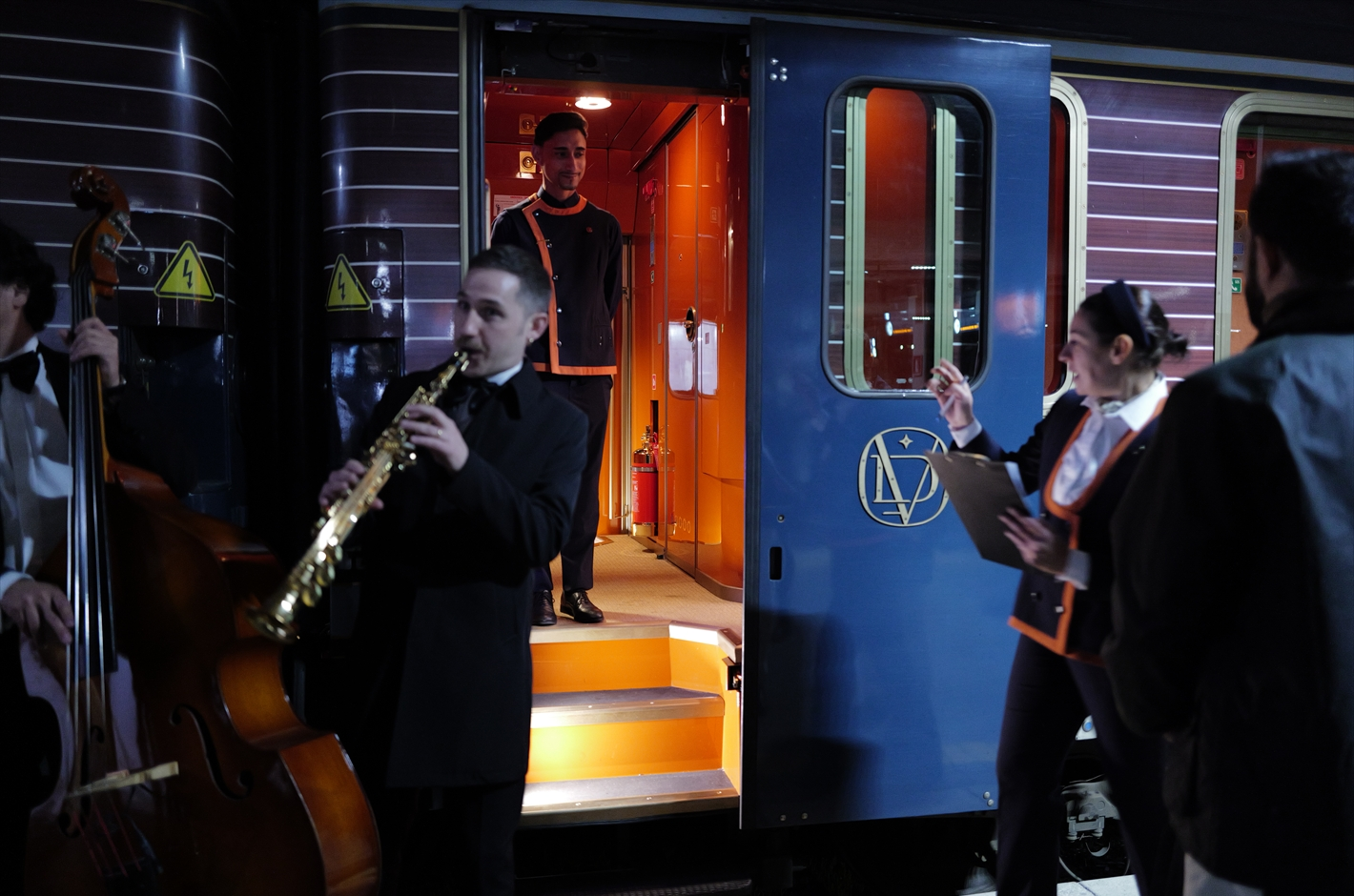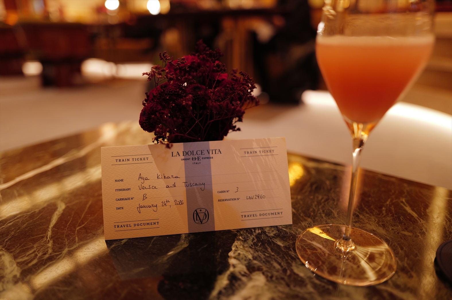 快適な専用車でオスティエンセ駅へ。事前に登録されている車両での到着のため、駅の敷地内に入ると同時に誘導されたのは、ラ ドルチェ ヴィータ オリエント エクスプレスの世界観を感じる優雅な専用ラウンジ前の車寄せ。迎え入れられたラウンジではトリオの生演奏、バーテンダーがふるまうカクテル、食欲をそそるカナッペがふるまわれる別世界だ。そして、すっかりとくつろいでいるところにスタッフが届けてくれたのは乗車券。まさにTicket to Sweet Journey!